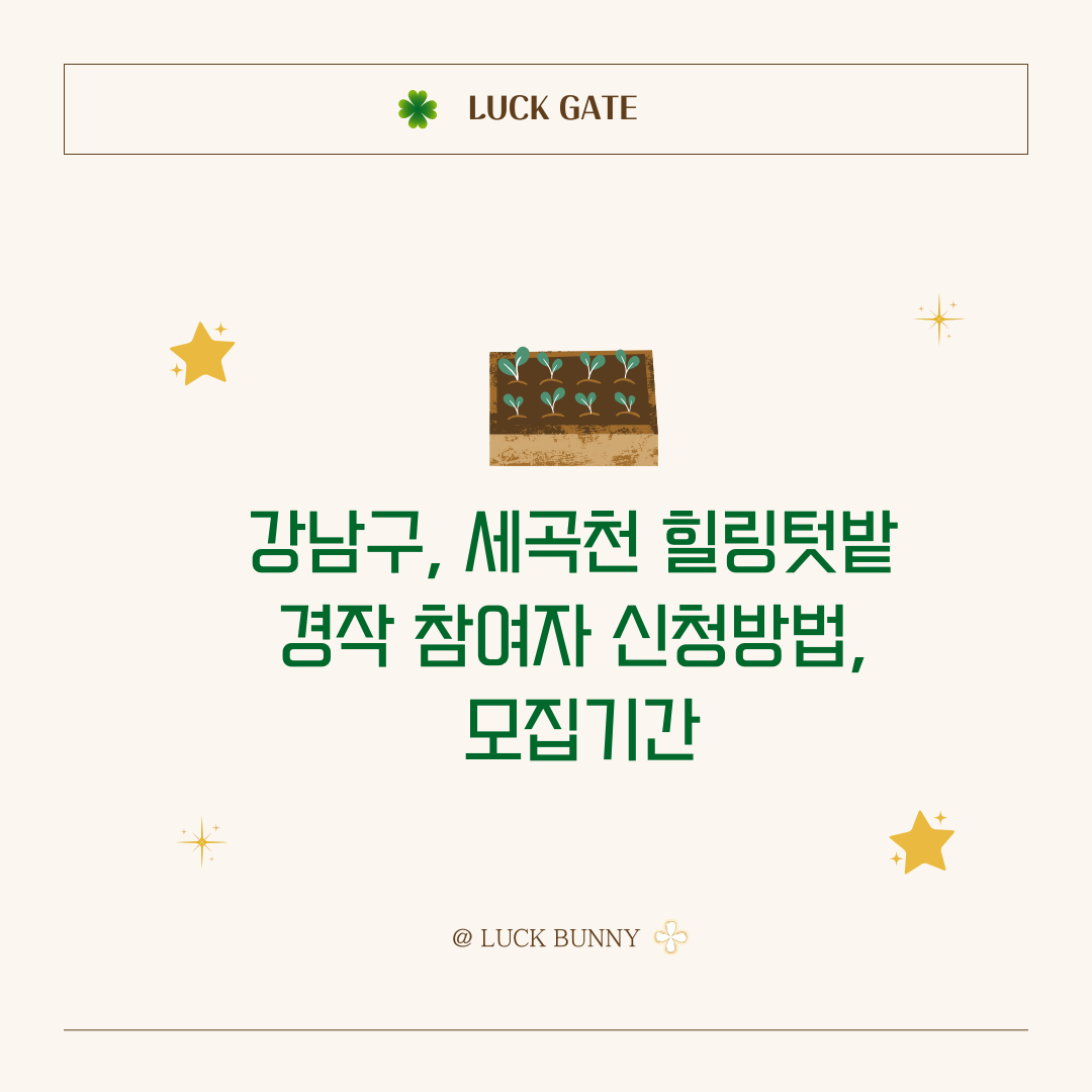 - 신청 방법: 강남구청 홈페이지(소통·참여 → 신청 → 세곡천 힐링텃밭 분양)에서 온라인 접수