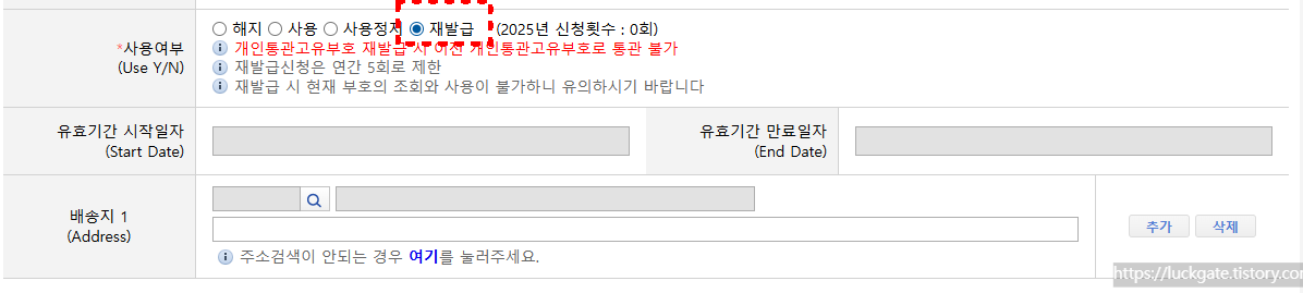 개인 통관 고유부호는 변경과 동시에 기존 번호는 자동으로 만료돼요. 그래서 재발급했다면 아래 정보도 꼭 함께 수정해야 해요.