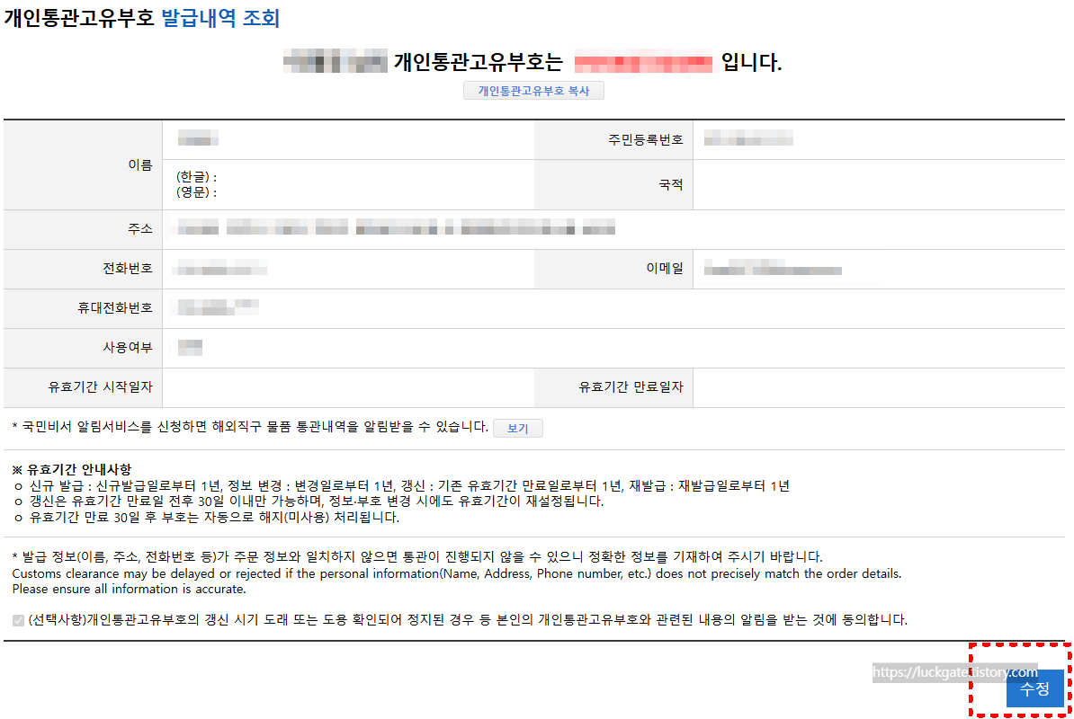 4) 인증이 끝나면 기존에 사용 중인 개인 통관 고유부호가 화면에 바로 보여요.수정을 눌러주세요