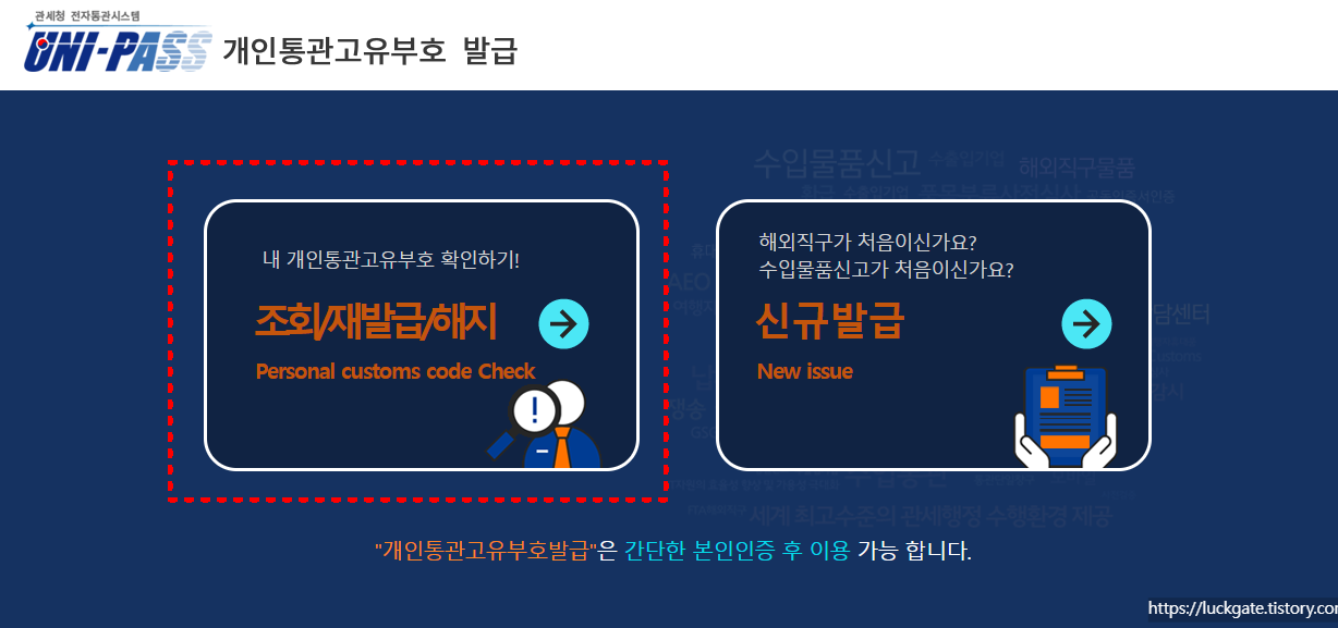 개인 통관 고유부호 재발급은 관세청 유니패스(UNI-PASS) 개인통관고유부호 발급/조회 시스템에서 할 수 있어요. PC와 모바일에서 모두 가능해서 편한 쪽으로 접속하면 돼요. 검색창 사이트에서 관세청 이라고 검색해주세요.