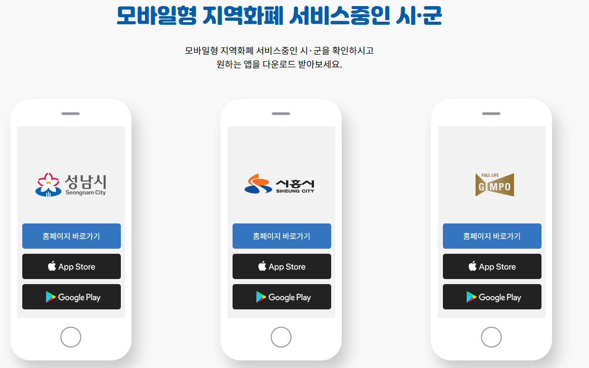 모바일형 지역화폐 서비스 중인 지역을 확인하고 원하는 곳의 앱을 다운로드 받으시면 됩니다.
