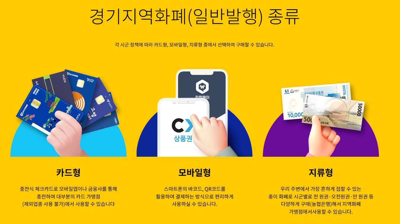 경기지역화폐는 경기도 31개 시·군에서 발행한 카드형, 모바일형, 지류형의 선불식 화폐로, 해당 지역 내 가맹점에서만 사용할 수 있어요. 전통시장과 소상공인 점포에서의 소비를 늘리고 지역경제를 살리는 데 기여하고 있답니다. 그러나 대형마트, 백화점, 기업형슈퍼마켓(SSM), 프랜차이즈 직영점, 유흥업소, 사행업소에선 사용할 수 없으니 주의해야 합니다. 연 매출 10억 이하 소상공인 점포에서 주로 사용 가능해요.