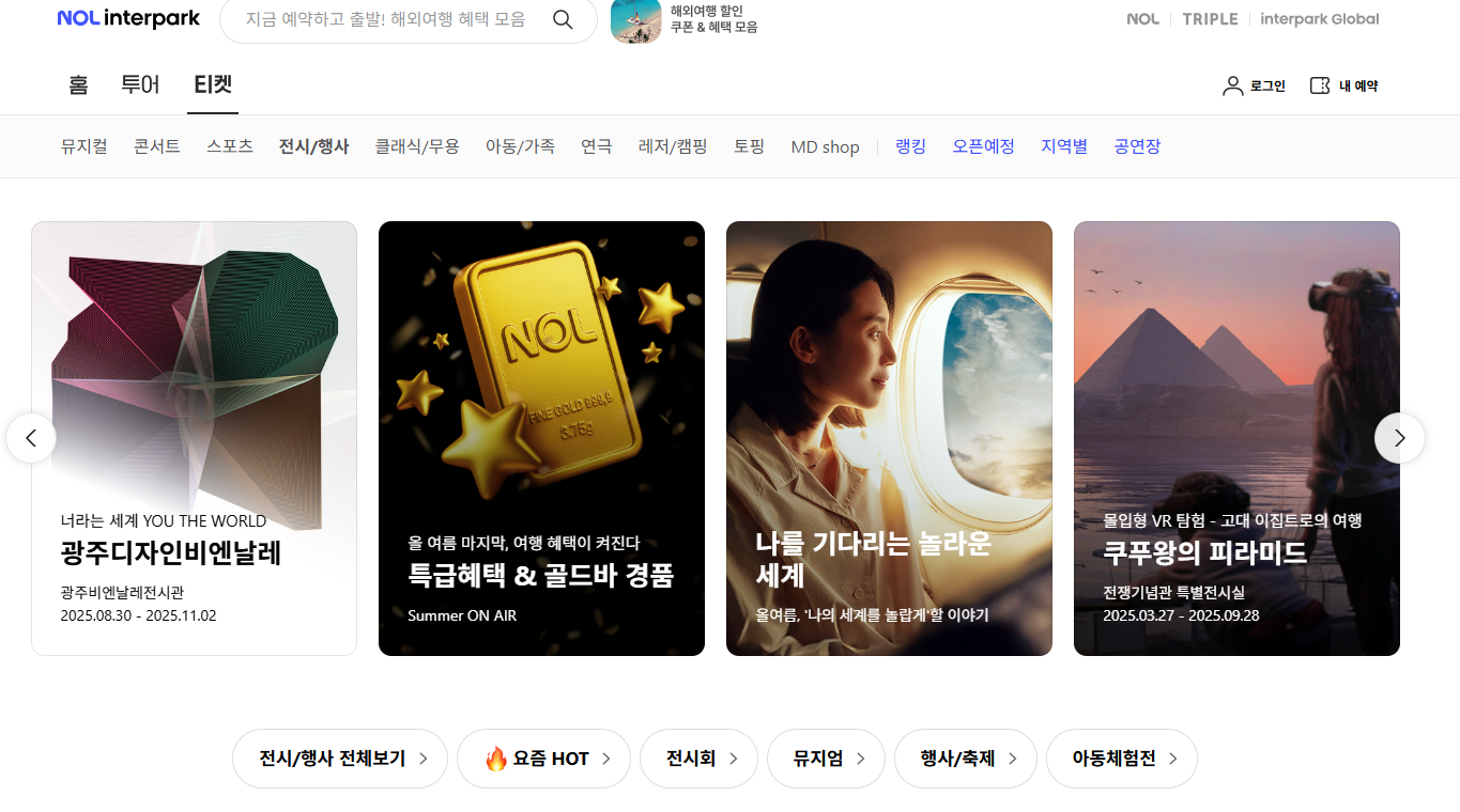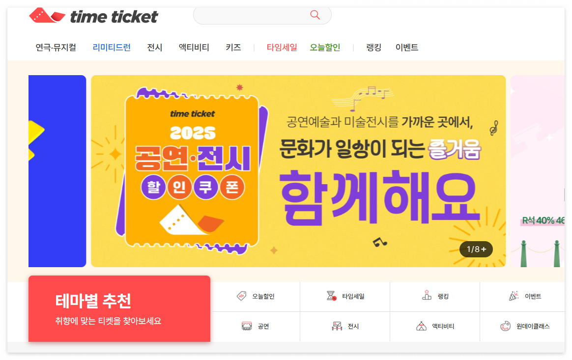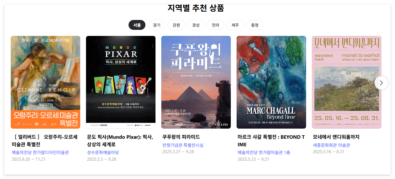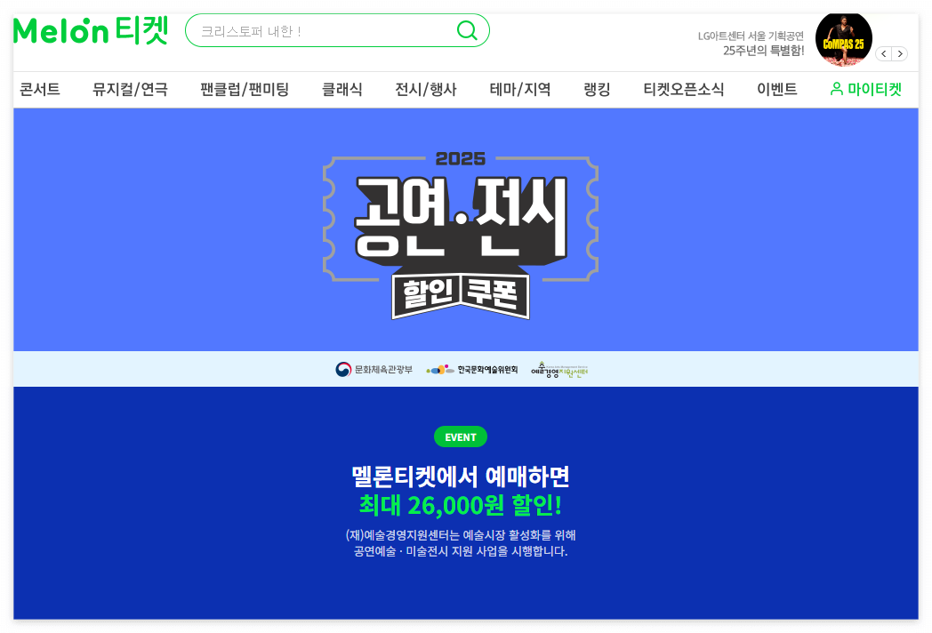 - 공연: 연극, 뮤지컬, 클래식, 국악, 무용, 복합 장르