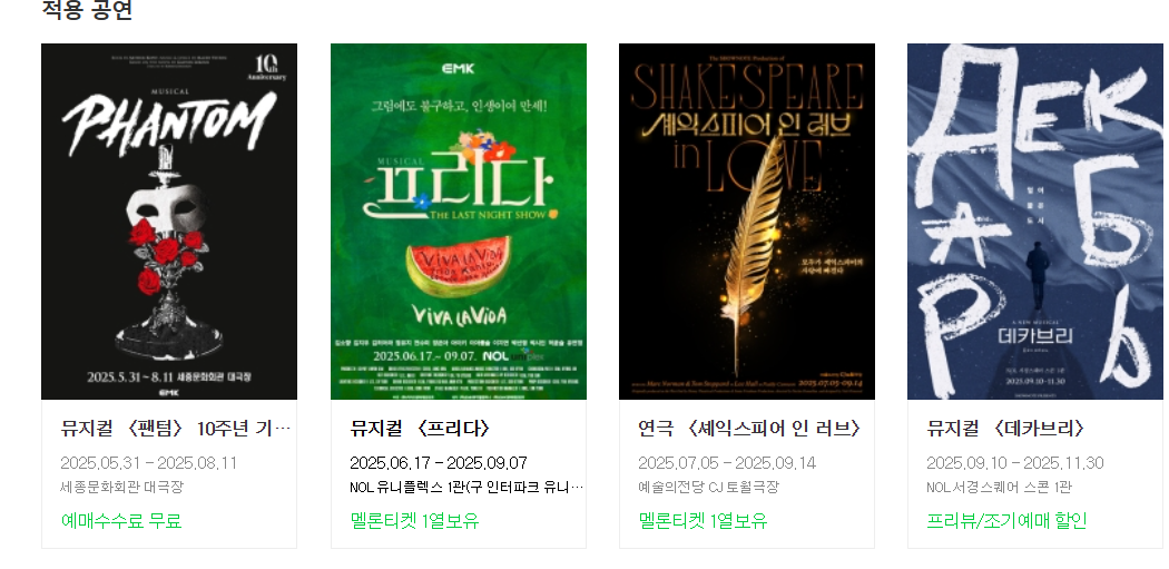 - 타 할인과 중복 가능(예매처 정책 확인)