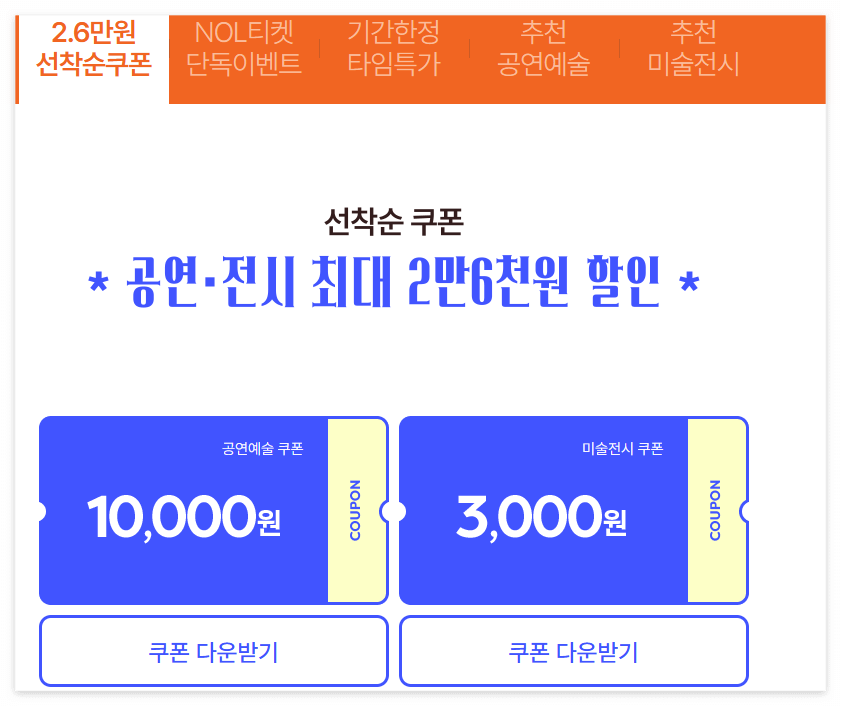 할인권은 온라인 예매 전용이에요. 현장 발권 시 적용되지 않으니 반드시 예매처 웹사이트나 앱을 이용해야 해요. 발급받은 할인권은 결제 단계에서 선택하면 자동으로 할인 금액이 적용돼요. 또, 예매처별로 공연과 전시 각각 2매까지 받을 수 있어 최대 10매(공연) + 10매(전시)까지 발급이 가능해요.