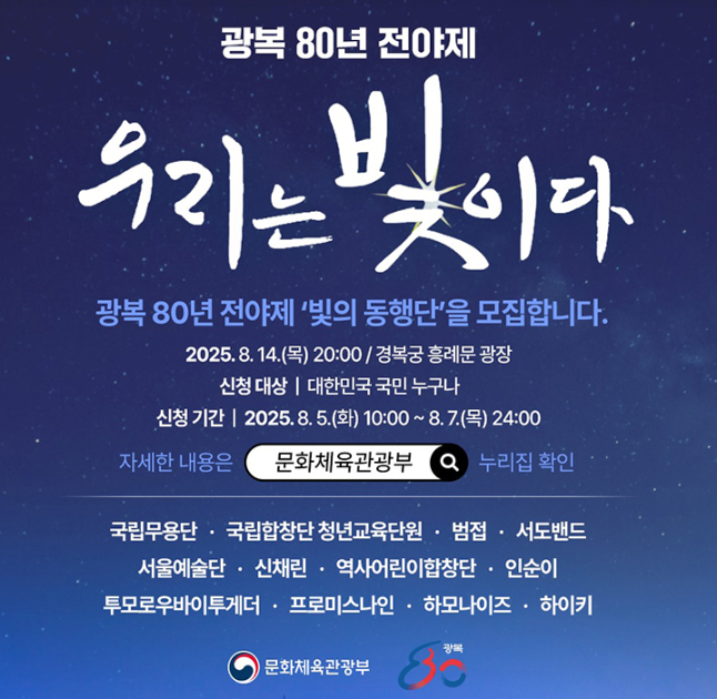 경복궁 흥례문 광장에서 진행되는 광복 80주년 전야제는 ‘우리는 빛이다’ 라는 슬로건으로 진행돼요.