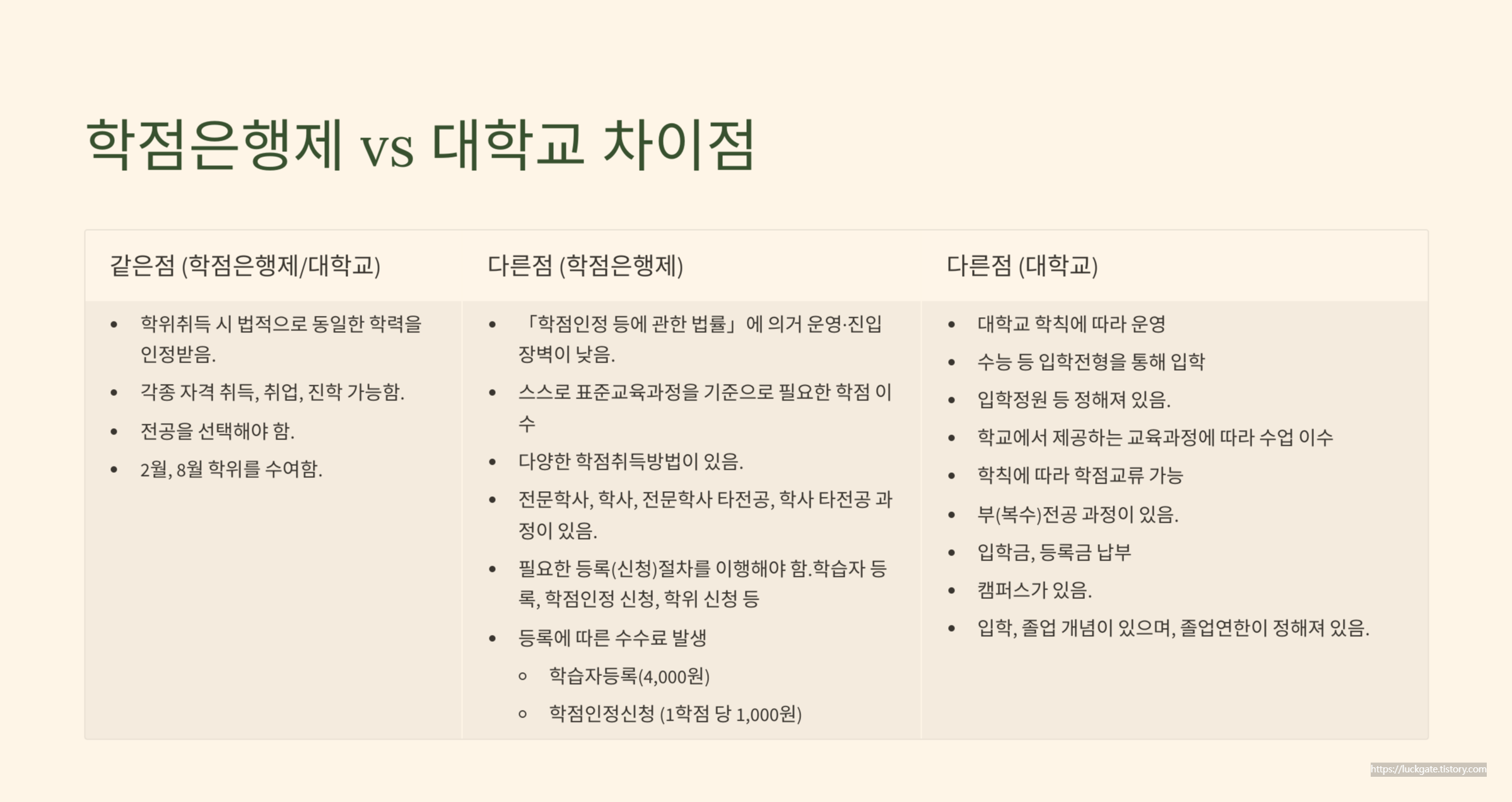- 학점은행제: 등록금이 일반 대학과 비교했을 때 굉장히 낮습니다. 듣는 과목의 수 만큼 비용을 납부하므로, 한 과목만 수업을 듣는다면 해당 과목에 대한 비용만 지불하면 됩니다.