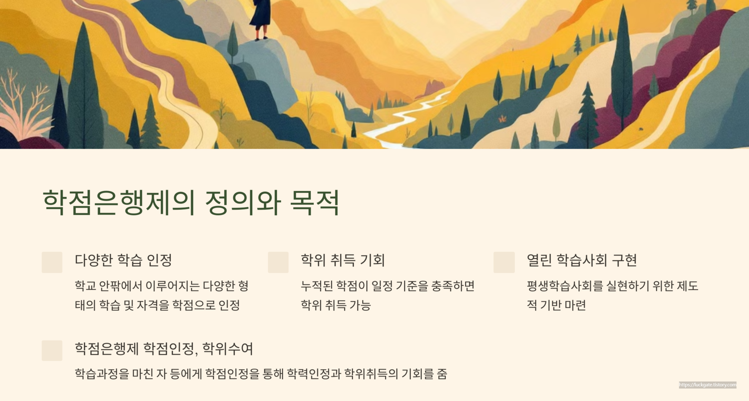 학점은행제는 학교에서 뿐만 아니라 학교 밖에서 이루어지는 다양한 형태의 학습 및 자격을 학점으로 인정받을 수 있도록 하고, 학점이 누적되어 일정 기준을 충족하면 학위취득을 가능하게 함으로써 열린 학습사회, 평생학습사회를 구현하기 위한 제도입니다.