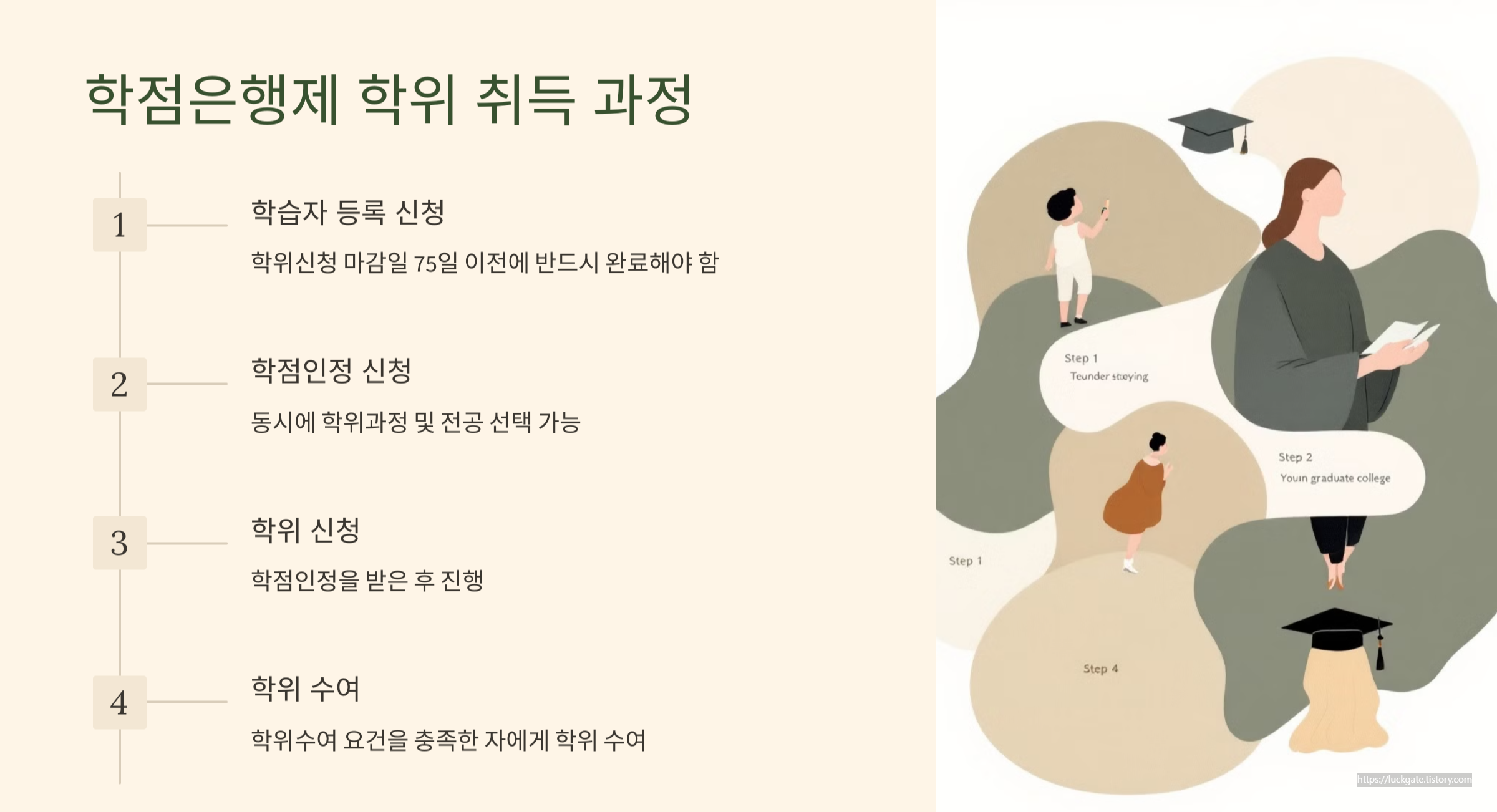 학점은행제에서는 학습자 등록 신청, 학점인정 신청, 학위 신청을 완료하고 학위수여 요건을 충족한 자에게 학위를 수여합니다. 학습자는 최소 1번의 신청을 하며, 학점인정 신청과 동시에 학위과정 및 전공을 선택할 수 있습니다. 학위신청 마감일 75일 이전에 학습자 등록 신청을 해야 하며, 학점인정을 받은 후 학위신청을 하게 됩니다.