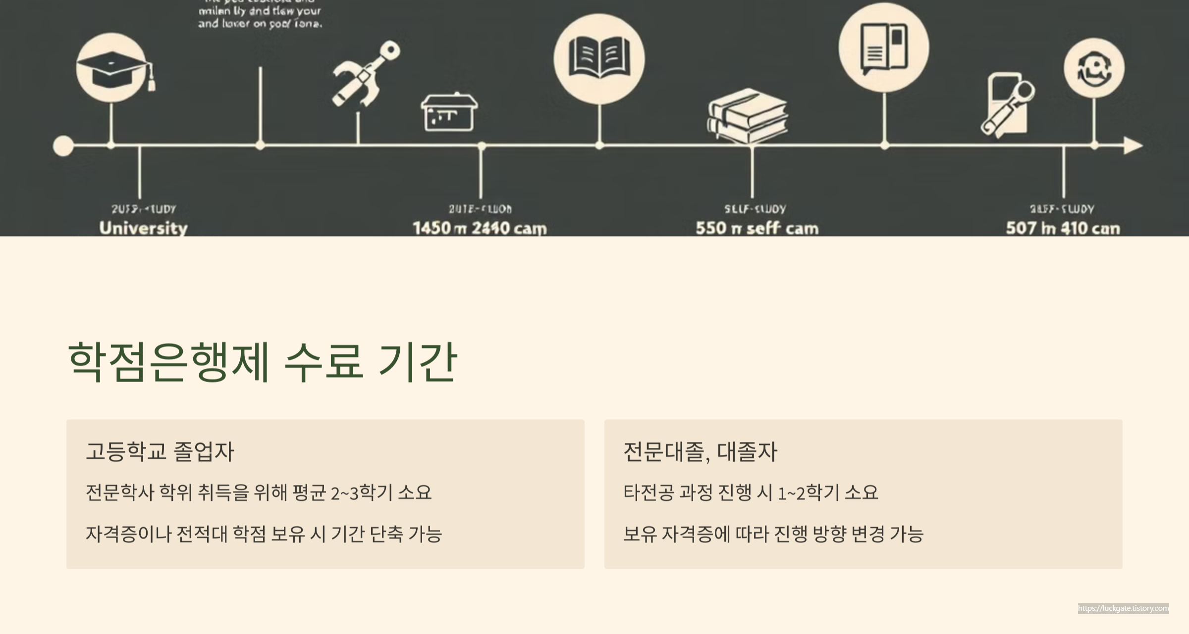 - 학점은행제 : 고등학교 졸업자 기준으로 전문학사 학위를 취득하기 위해서는 약 2~3학기 정도가 소요되며, 보유하고 계신 자격증이나 전적대 학점이 있으면 기간이 더욱 단축될 수 있습니다