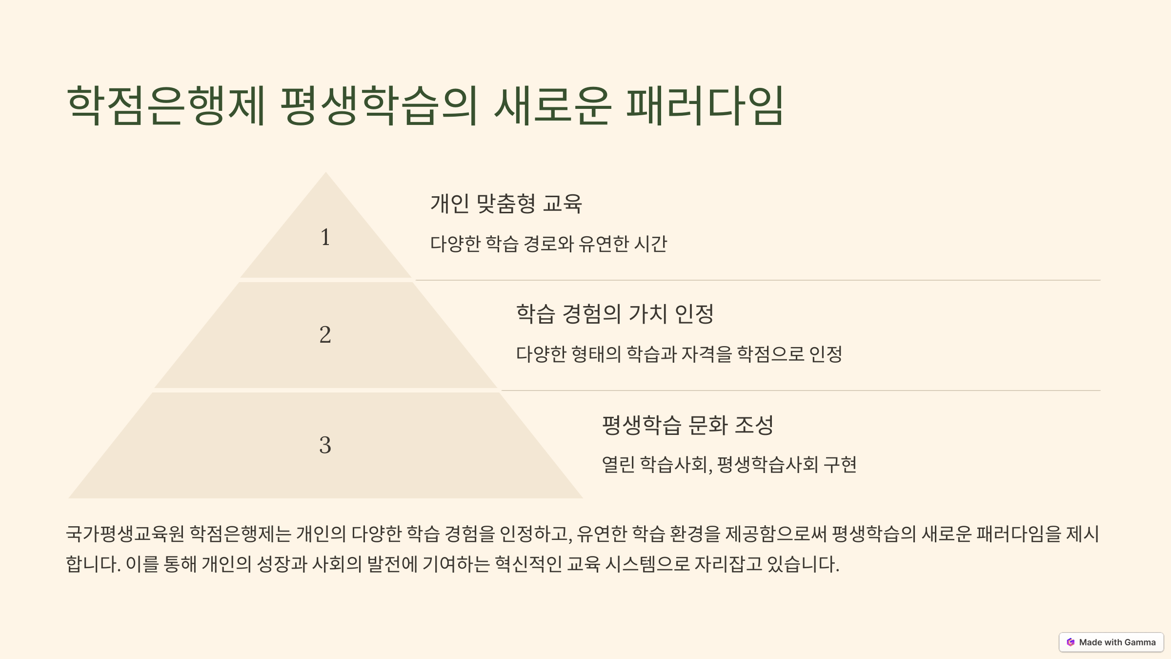 학점은행제는 전통적인 대학교육 뿐만 아니라 다양한 교육 및 실무 경험을 통해 학점을 인정받을 수 있습니다. 이를 통해 개인의 다양한 학습 경험과 지식을 공식적인 학위로 표현할 수 있습니다