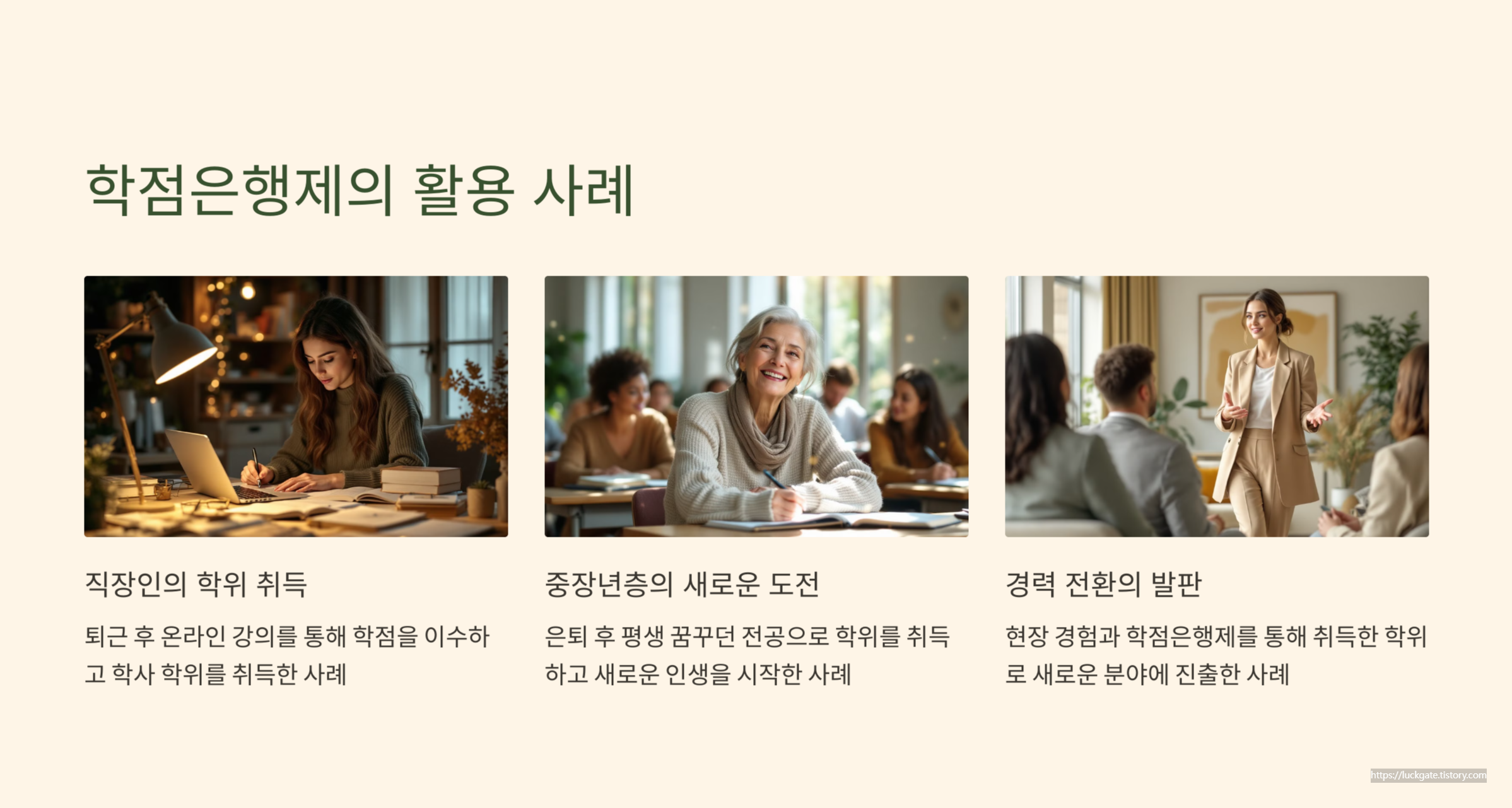 학점은행제는 전통적인 대학교육과 달리 개인의 생활 패턴에 맞추어 학습을 진행할 수 있어, 직장인이나 가정주부 등 다양한 사람들이 학습을 이어나갈 수 있습니다