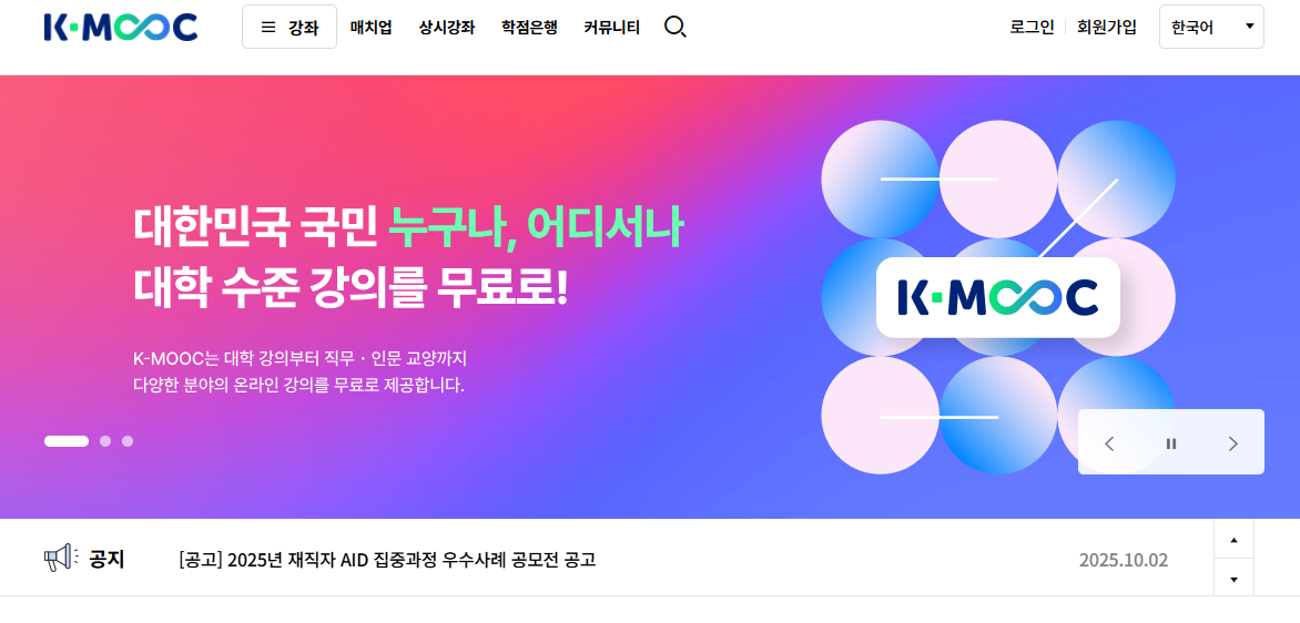 K-MOOC는 교육부와 국가평생교육진흥원이 운영하는 국가 평생 학습 플랫폼이에요. 서울대학교, 카이스트 등 국내 유수 대학 및 기관의 강의를 무료로 제공하고 있어요. 학문적인 깊이가 있는 교양 강좌나 전공 기초 지식을 습득하고 싶은 성인들에게 최고의 선택이에요. 취업이나 직무 스킬보다는 순수한 지식 습득, 학위 과정 보충 학습 등 학술적인 목적으로 활용하기에 아주 유용해요. 수강 후 이수증을 발급받을 수도 있어요!