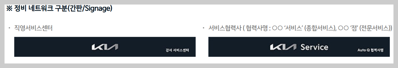 기아자동차 정비스비스 네트워크 구분입니다. 위에 보시면 간판으로 구분이 가능하다고 하는데요 직영 서비스 센터와, 서비스 협력사로 구분할수 있습니다. Auto Q 검색/예약 안내 Auto Q 검색에서 온라인 정비 예약까지 고객님이 원하시는 장소와 시간에 차량 관리를 받을수 있고, 지역/키워드/조건 중 한가지 검색 조건을 선택하여 Auto Q를 검색해 이용가능합니다
