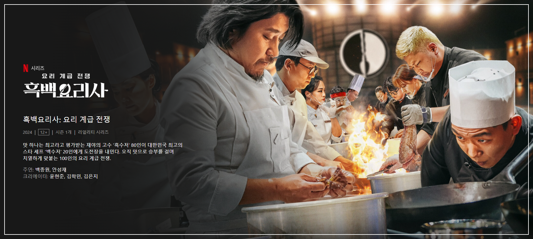 넷플릭스 흑백요리사가 2024.09.17 첫 공개가 되었는데요 총 4화까지 공개가 되었습니다. 많은 출연진이 대거 나왔죠? 알만한 사람은 다 나온것같네요^^ 유명셰프는 백수저계급, 무명셰프는 흑수저계급,서로 대결하는 내용입니다. 정말 흥미진진합니다. 마지막 4회에서는 최현석이 탈락하는지 궁굼여부가 제일 중요하겠죠? 그 내용은 5회에서 공개가 된다고 합니다.