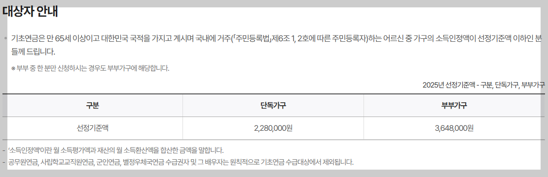 - 거주 요건: 한국에 거주하는 만 65세 이상의 노인이 해당합니다.