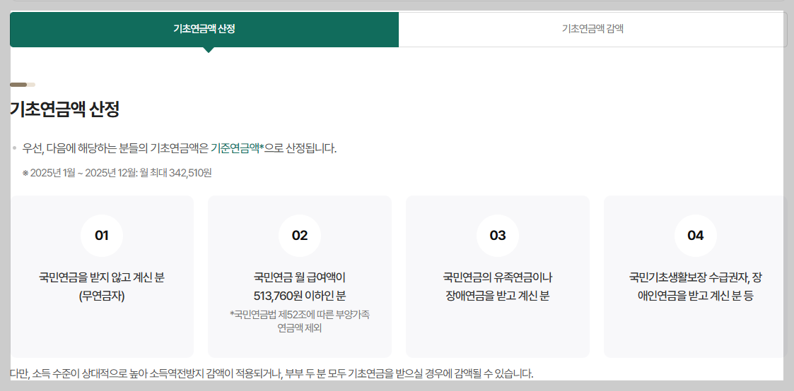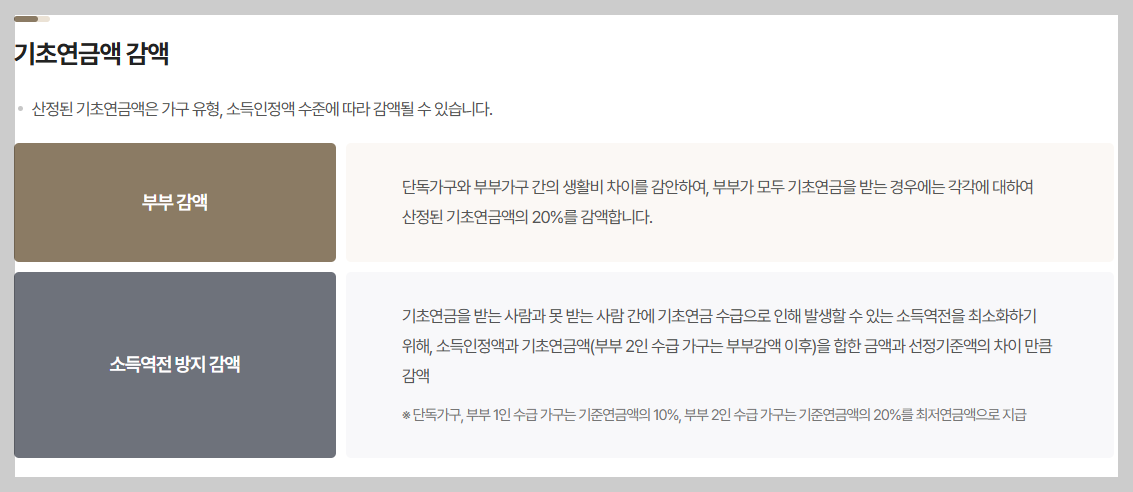 - 부부 감액: 부부가 모두 수급할 경우 각각 20% 감액(국민연금 수급액에 따른 차등 지급)