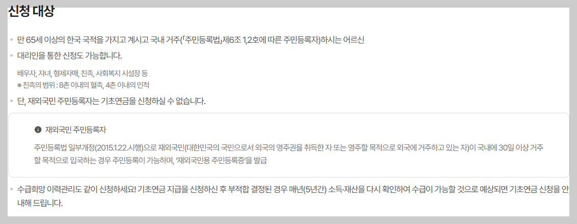 - 거주 요건: 한국에 거주하는 만 65세 이상의 노인이 해당합니다.