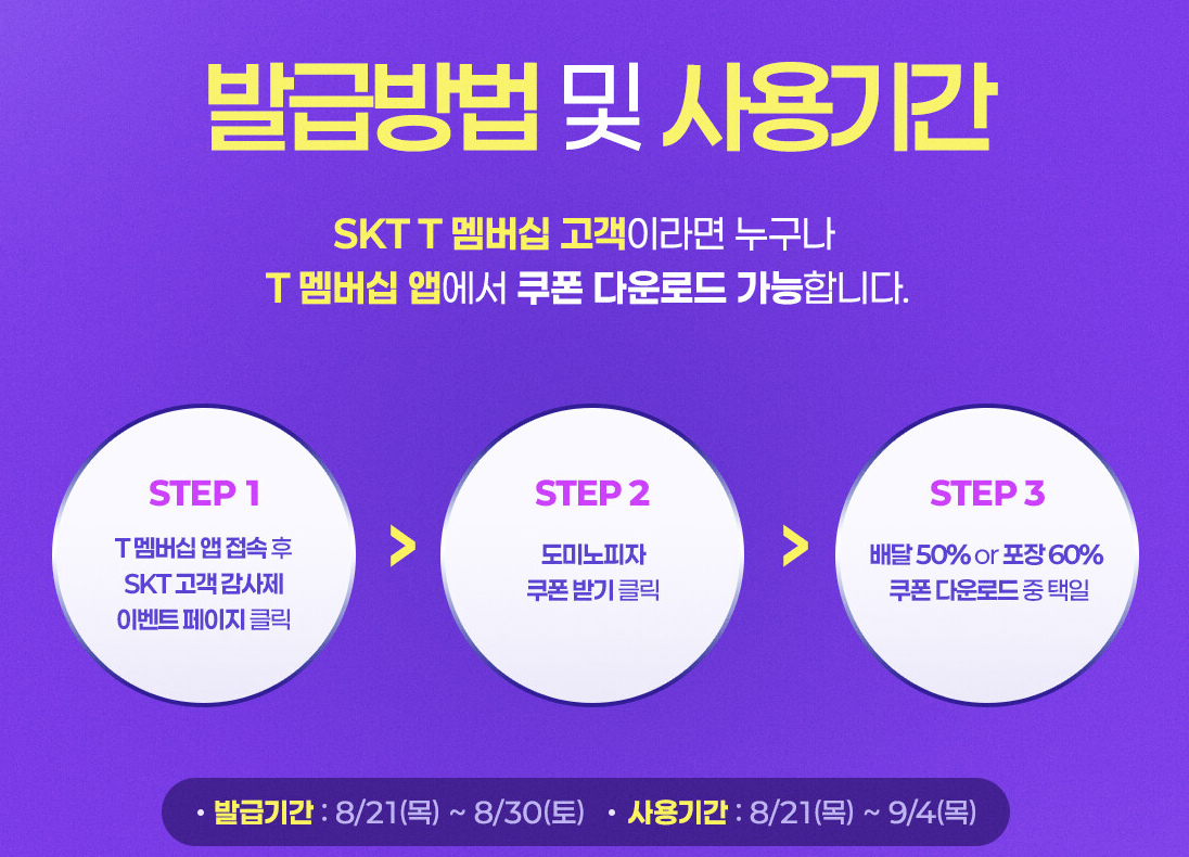 8월에는 SKT T멤버십 고객들을 위한 특별한 고객 감사제 프로모션이 열리고 있어요.배달 주문은 50% 할인, 포장 주문은 60% 할인이라는 파격적인 혜택이 제공되고 있어서 피자를 좋아하는 분들에게 정말 큰 기회에요.이번 프로모션은 단순한 할인 이벤트가 아니라, 도미노피자와 함께하는 특별 제휴 행사로, 신제품 출시와 다양한 굿즈 혜택, 공항 라운지 할인까지 준비되어 있어 풍성한 즐거움을 느낄 수 있어요.