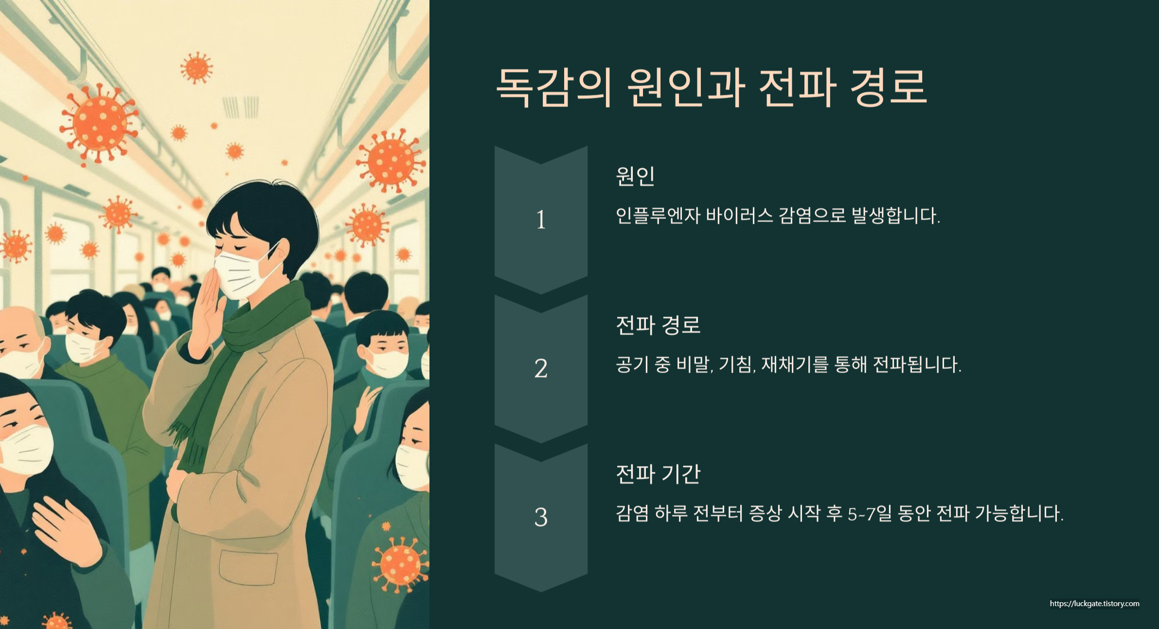 독감은 인플루엔자 바이러스의 감염으로 인해 발생합니다. 주로 공기 중의 비말, 즉 기침이나 재채기를 통해 전파되며, 감염된 사람이 만진 물체를 통해서도 감염될 수 있습니다. 환자가 감염된지 하루 전부터 증상이 시작된 후 5~7일 동안 타인에게 전파될 가능성이 있습니다.