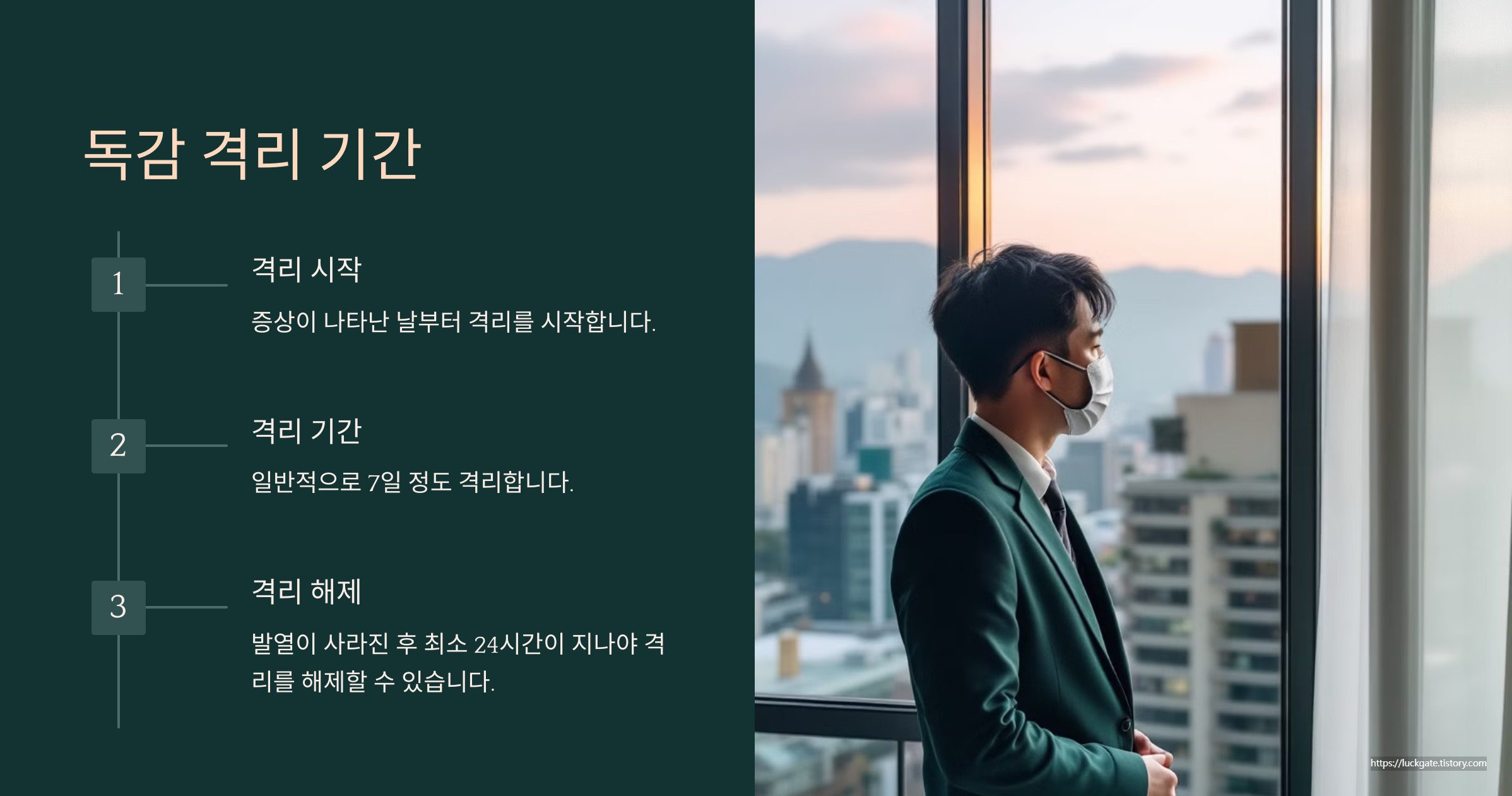 - 증상이 사라진 후 최소 24시간 경과: 발열이 사라진 이후 최소 24시간이 경과해야 격리를 해제할 수 있습니다. 이는 약물 복용으로 인해 증상이 완화된 경우도 포함됩니다.
