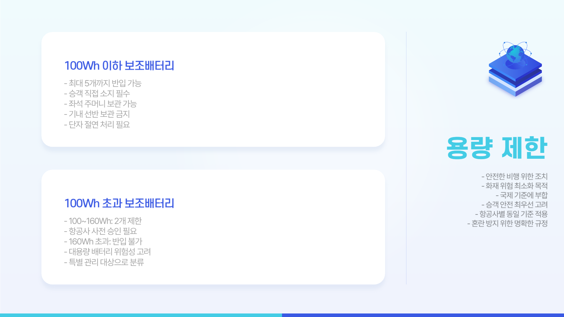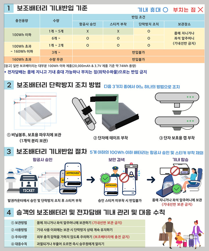 - 100Wh 이하의 보조배터리는 최대 5개까지 반입 가능합니다.