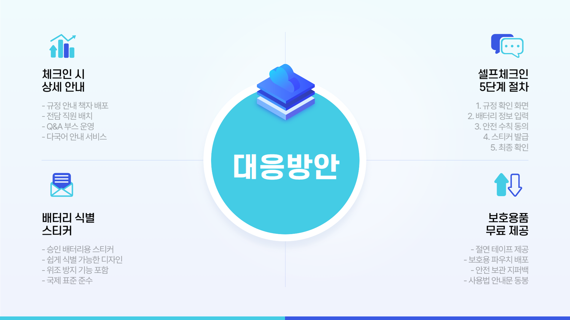 보조배터리 안전 보관을 위한 지원 방안 체크인 카운터와 기내에서는 단락방지용 투명 비닐봉투가 제공되어, 승객들이 쉽게 사용할 수 있도록 지원됩니다.