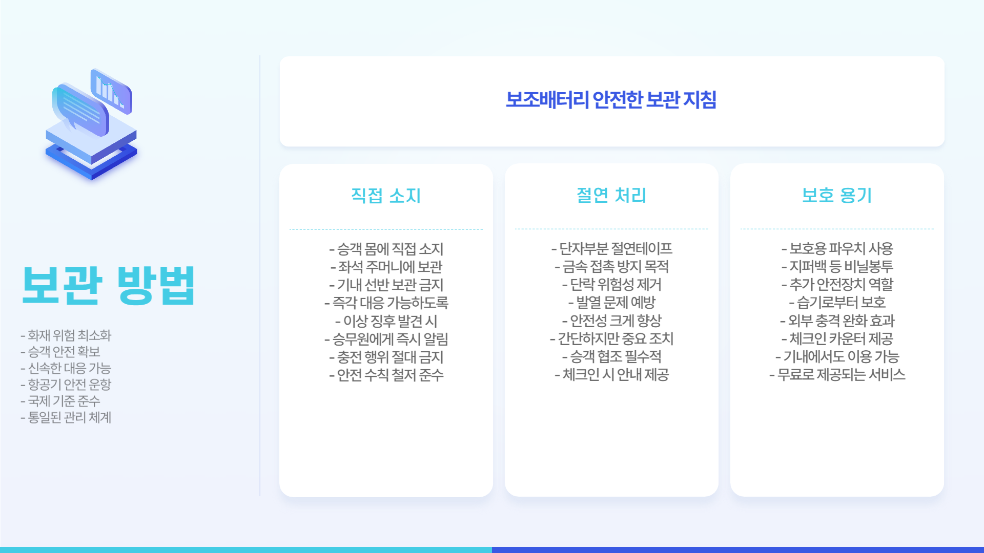 - 기내 선반에 보관하는 것은 금지되며, 이상 징후 발생 시 즉각 대응할 수 있도록 해야 합니다.