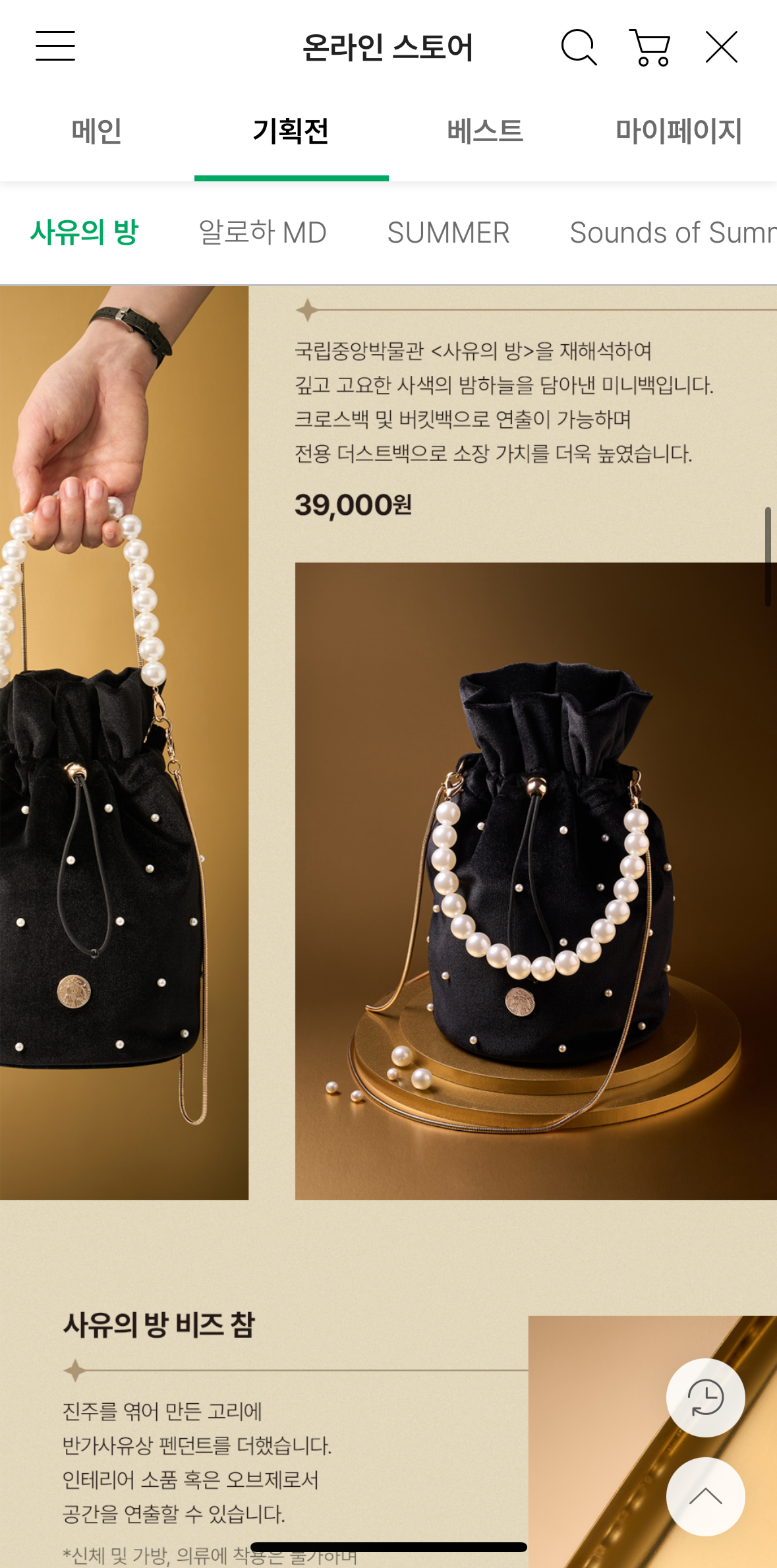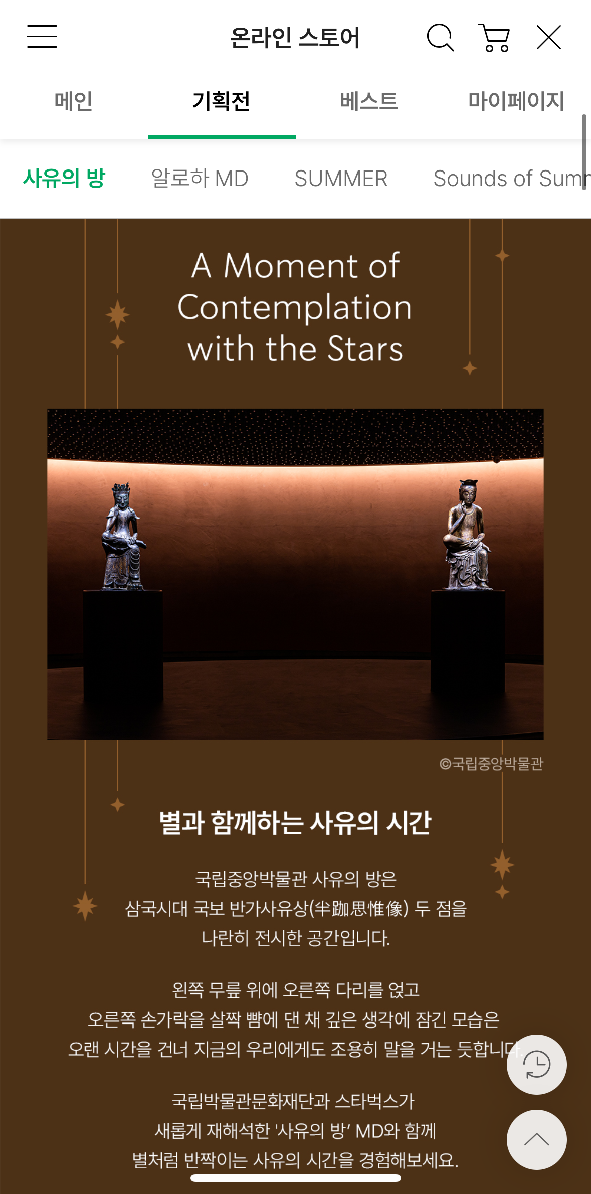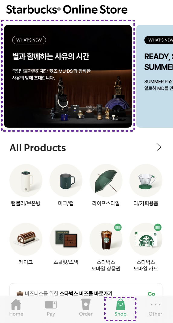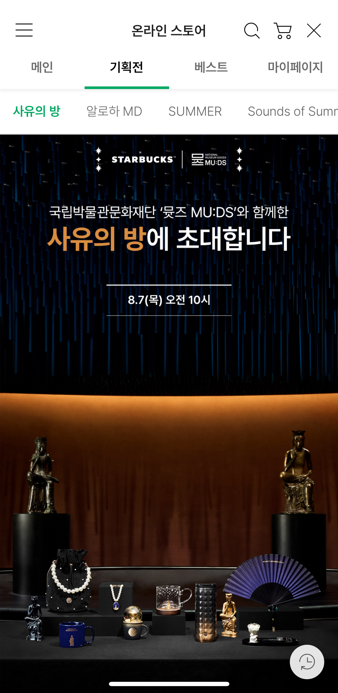 먼저, 스타벅스 어플에서 shop 페이지로 들어가줍니다. > 스타벅스 온라인 스토어 라는 페이지 들어가지면> 별과 함께하는 사유의 시간이라는 국립박물관 문화재단 '뮷즈 MU:DS' 페이지를 눌러주세요! 그럼 아래 처럼 해당 이벤트가 소개되어요