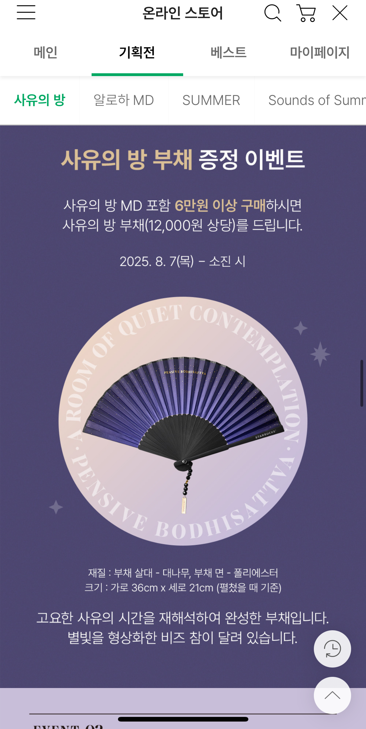 ‘사유의 방’ 굿즈 포함 6만 원 이상 구매 시, 선착순으로 ‘사유의 방 부채’가 증정돼요. 예쁜 일러스트가 그려진 이 부채는 굿즈 못지않게 인기가 많다고 해요.
