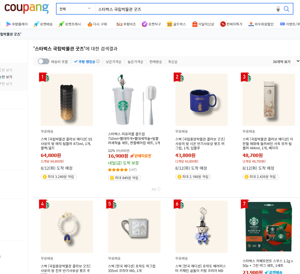 쿠팡에서도 스타벅스 국립박물관 굿즈를 판매하고 있는데요. 일반배송이라 새벽배송,로켓배송은 어려운 상품이 많아요