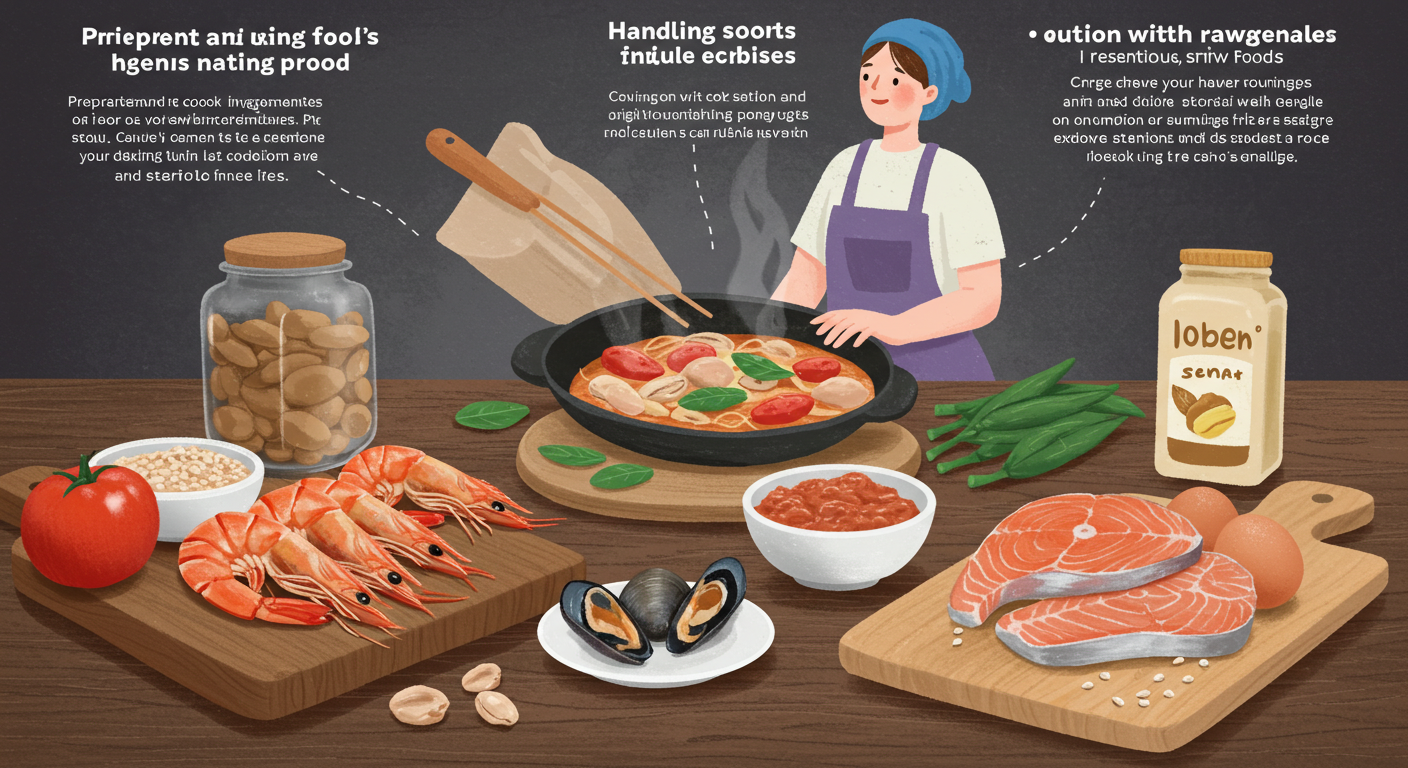 - 생식 주의: 조개류나 생선 같은 해산물, 계란 등은 완전히 익혀서 섭취하는 것이 안전해요.