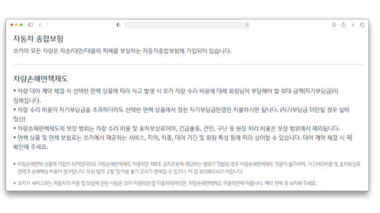 운전은 항상 조심해야 하지만, 혹시 모를 사고에 대비하는 건 필수죠. 쏘카는 모든 차량이 자동차 종합보험에 가입되어 있고, 운전자도 대인, 대물, 자손 보험 혜택을 받아요. 이때 내가 부담해야 하는 보험료는 '자기부담금' 수준에 따라 달라져요.