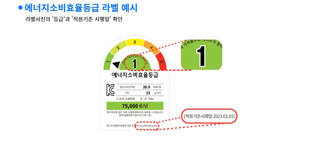 - 제품 라벨에 표시된 에너지효율등급이 반드시 기준에 맞아야 함