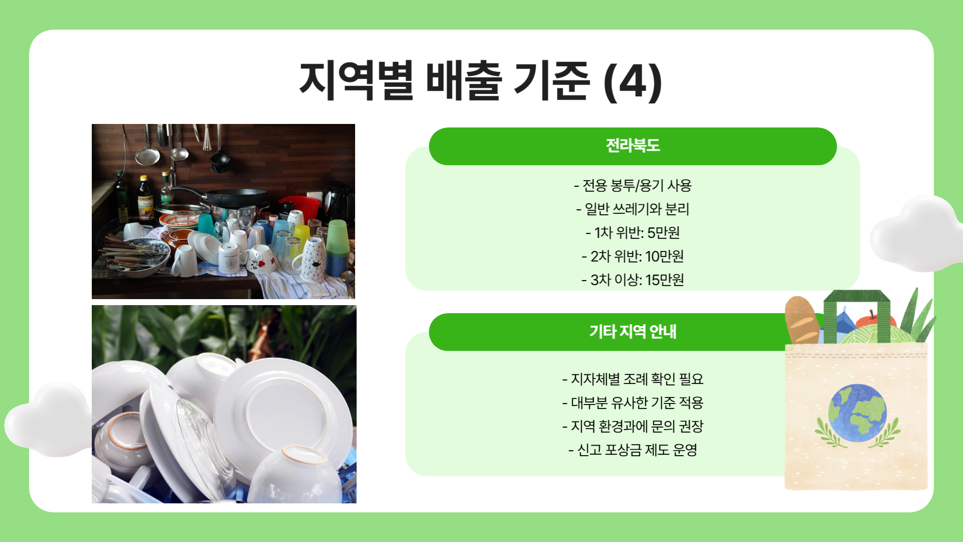 - 음식물 쓰레기 배출 방법: 전북의 경우도 음식물 쓰레기는 음식물 전용 봉투 또는 전용 수거용기에 배출해야 합니다. 일반 쓰레기와 섞어서 버리면 과태료가 부과됩니다