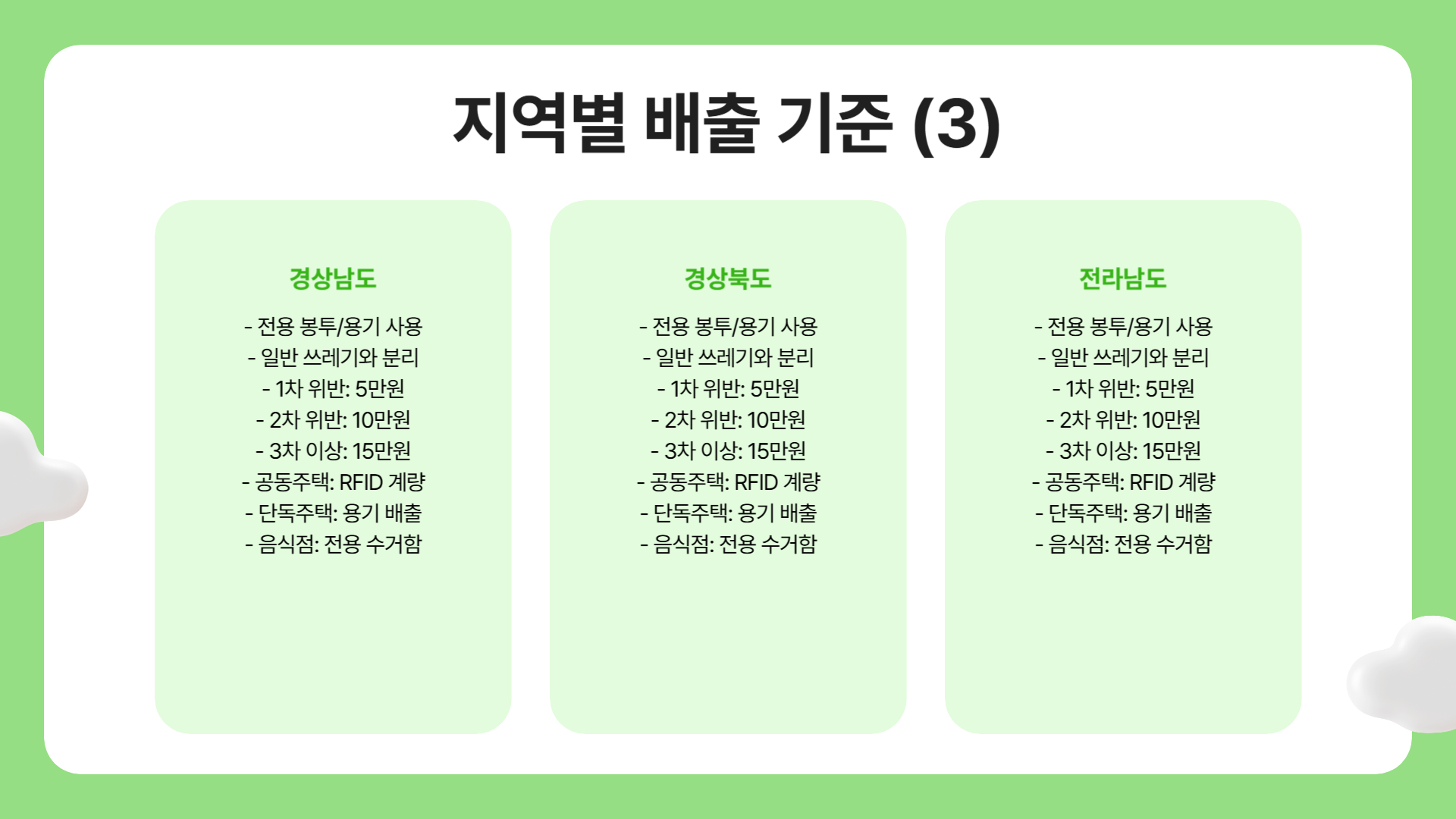 - 음식물 쓰레기 배출 방법: 전남의 경우도 음식물 쓰레기는 음식물 전용 봉투 또는 전용 수거용기에 배출해야 합니다. 일반 쓰레기와 섞어서 버리면 과태료가 부과됩니다
