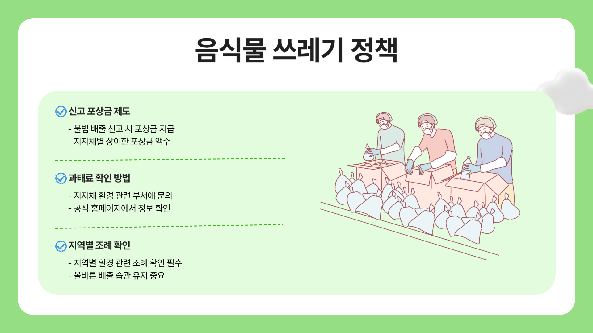 - 신고 포상금: 음식물 쓰레기와 일반 쓰레기를 섞어 배출하거나, 길거리에 무단으로 버리는 경우 이를 신고하면 신고포상금을 지급하는 지자체도 있습니다. 예를 들어, 서울 서초구에서는 쓰레기 투기를 신고할 경우 10만 원, 혼합배출을 신고하면 50만 원의 포상금을 지급합니다
