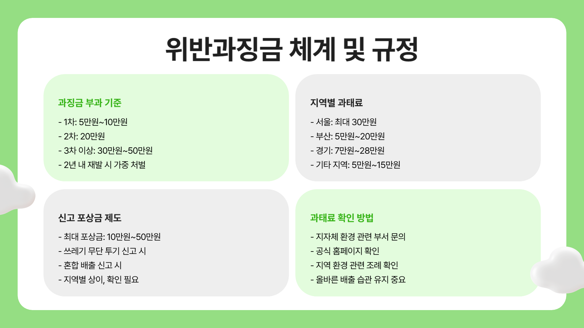 - 과징금 부과 기준: 음식물 쓰레기를 잘못 배출하면 최대 10만 원의 과태료가 부과될 수 있습니다. 1차 위반은 5만 원, 2차 위반은 10만 원, 3차 이상은 15만 원입니다