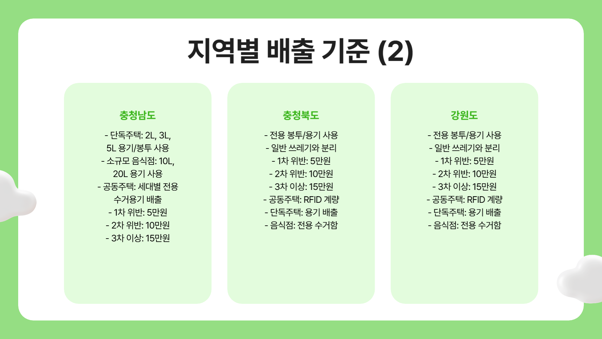 강원도에서는 음식물 쓰레기는 음식물 전용 봉투 또는 전용 수거용기에 배출해야 합니다. 일반 쓰레기와 섞어서 버리면 과태료가 부과됩니다