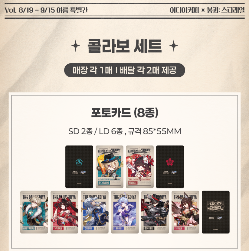 2025년 여름, 이디야커피가 글로벌 인기 게임 붕괴: 스타레일과 공식 콜라보레이션을 시작했어요!콜라보 주제는 LUCKY & CRAZY로, 스타피스 컴퍼니의 어벤츄린과 스파클 캐릭터를 중심으로 다양한 한정 굿즈와 세트 메뉴가 준비되었어요.이번 이벤트는 2025년 8월 19일부터 9월 15일까지 약 한 달간 진행되며, 매장 및 배달, 온라인 팝업 스토어 등 여러 경로를 통해 참여할 수 있어요.