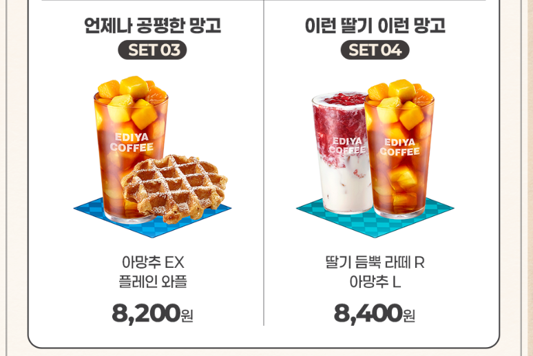 - SET 04 이런 딸기 이런 망고 : 딸기 듬뿍 라떼 R + 아망추 L (8,400원)