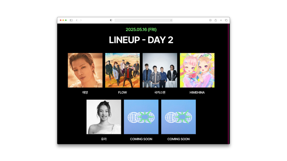 - DAY 2 (5/16 금): FLOW, 국카스텐, 유라, HIMEHINA, 태양 등 + 추가 공개 예정!