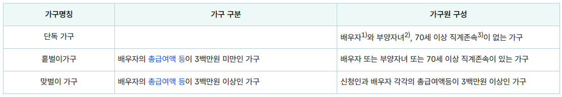 - 홑벌이가구 또는 맞벌이가구만 신청 가능합니다