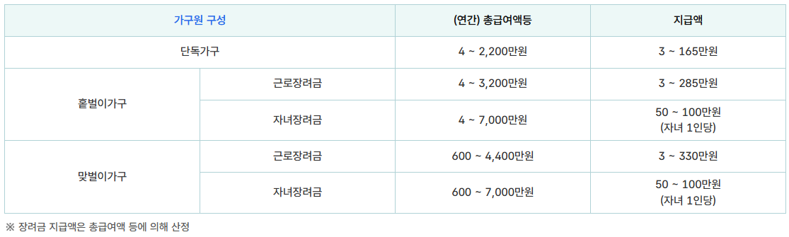 | 가구 형태 | 총소득 기준 | 자녀장려금 지급액 |