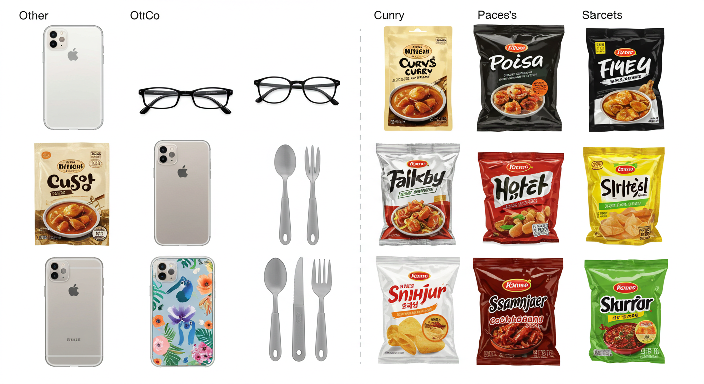 OTHER (기타): 햇반 등 즉석밥 용기 (복합재질), 일부 치약 튜브, 스마트폰 케이스, 안경테 (PC, TR 등), 레토르트 식품 파우치 (카레, 짜장 등), 믹스커피 봉지, 과자 봉지 (감자칩 등 다층필름), 쌈장/고추장 통 (복합재질), 주방용품 손잡이, 일부 젖병 (PC 등).