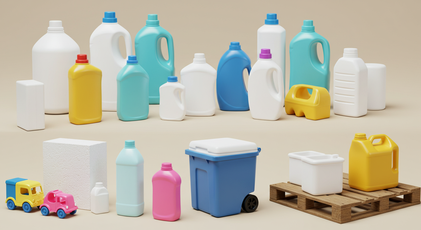 고밀도 폴리에틸렌 (HDPE): 우유통, 세제통, 샴푸/린스통, 섬유유연제 통, 아기 젖병 (일부 불투명), 플라스틱 장난감, 아이스박스 몸체, 쓰레기통, 플라스틱 팔레트, 엔진오일 통.