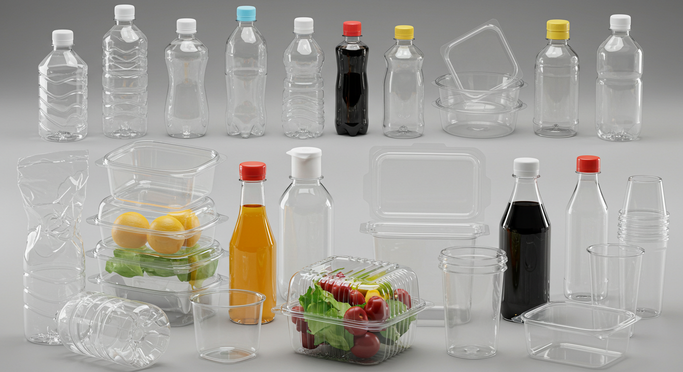 페트 (PET/PETE): 생수병, 탄산음료병, 투명 과일 포장 용기, 식용유 병, 투명 샐러드 용기, 투명 화장품 용기 (토너 등), 간장병 (일부), 테이크아웃 투명 컵.