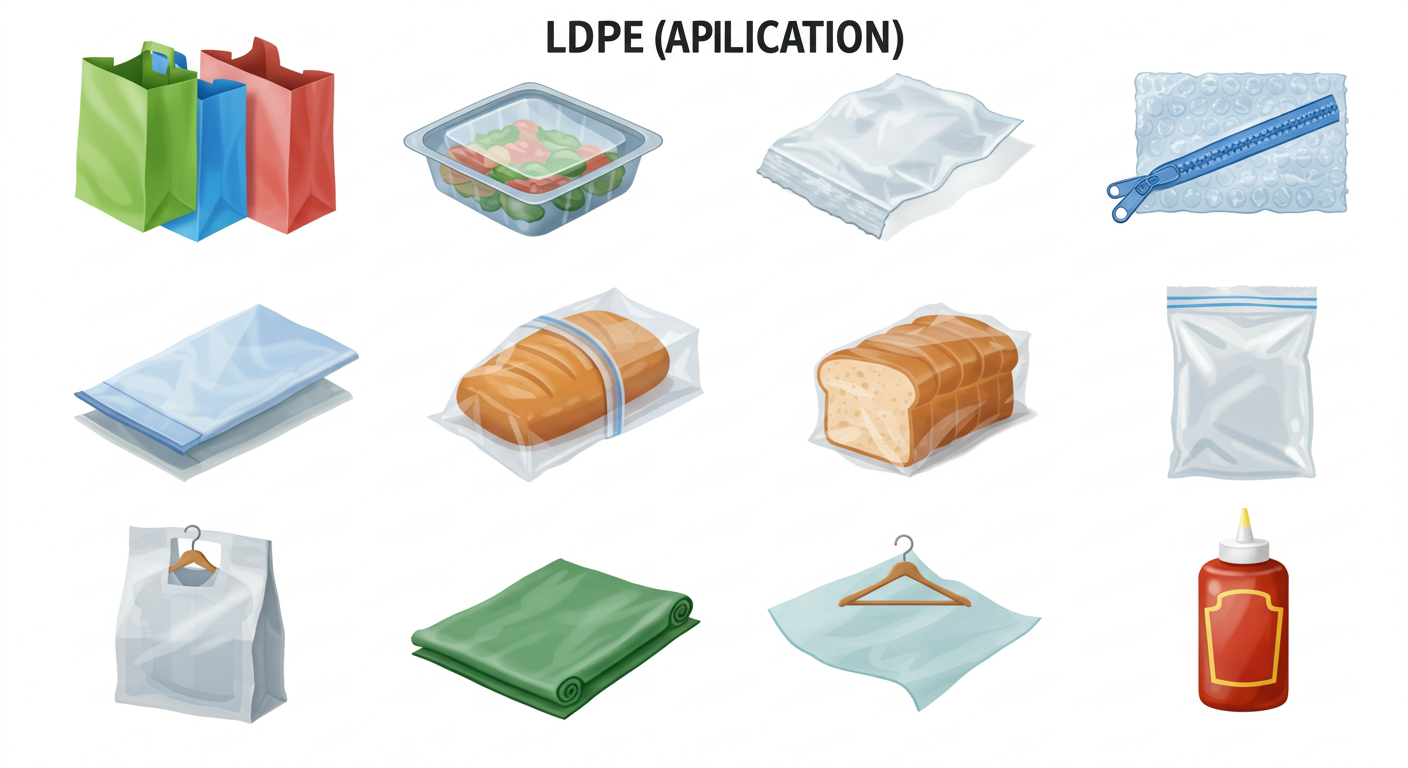 저밀도 폴리에틸렌 (LDPE): 얇은 비닐봉투 (쇼핑백 등), 식품 포장용 랩, 뽁뽁이(에어캡), 지퍼백, 빵 봉지, 세탁소 비닐 커버, 농업용 필름, 케첩/마요네즈 등 짜서 쓰는 소스통.