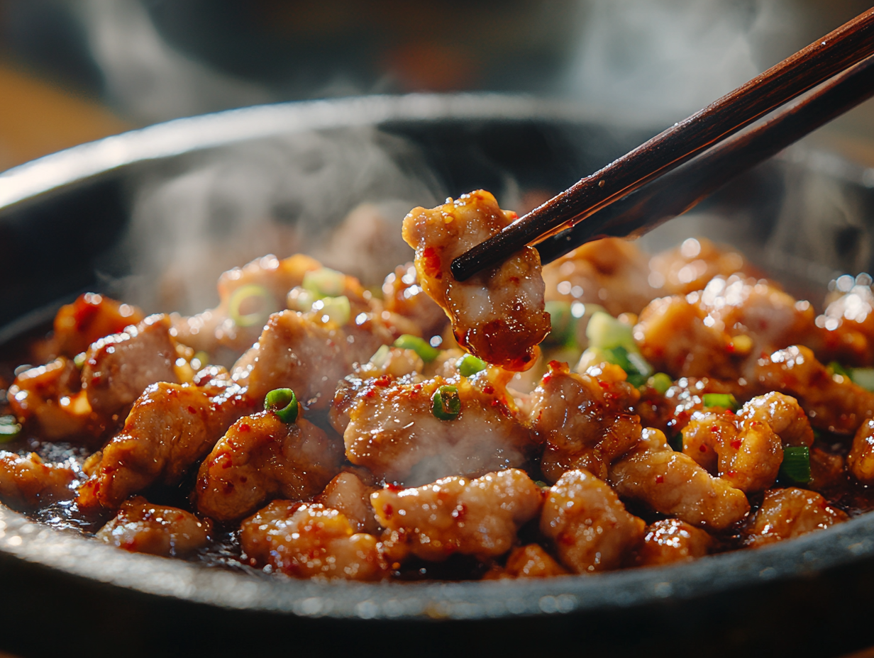 볶기 : 팬에 기름을 두르고 중불로 달군 후, 재워둔 돼지고기를 넣고 볶아주세요. 고기가 어느 정도 익으면 양파와 대파를 넣고 함께 볶아줍니다. 마지막에 청양고추를 넣어 매운 맛을 더해주면 좋아요.