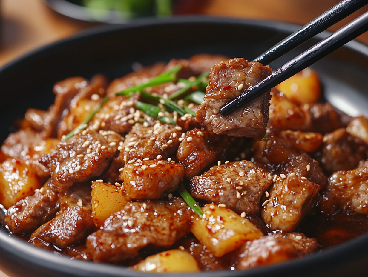 마무리 : 고기가 다 익고 양념이 잘 배어들면 참기름과 통깨를 뿌려 마무리합니다. 이렇게 하면 제육볶음이 더욱 고소하고 맛있어져요.